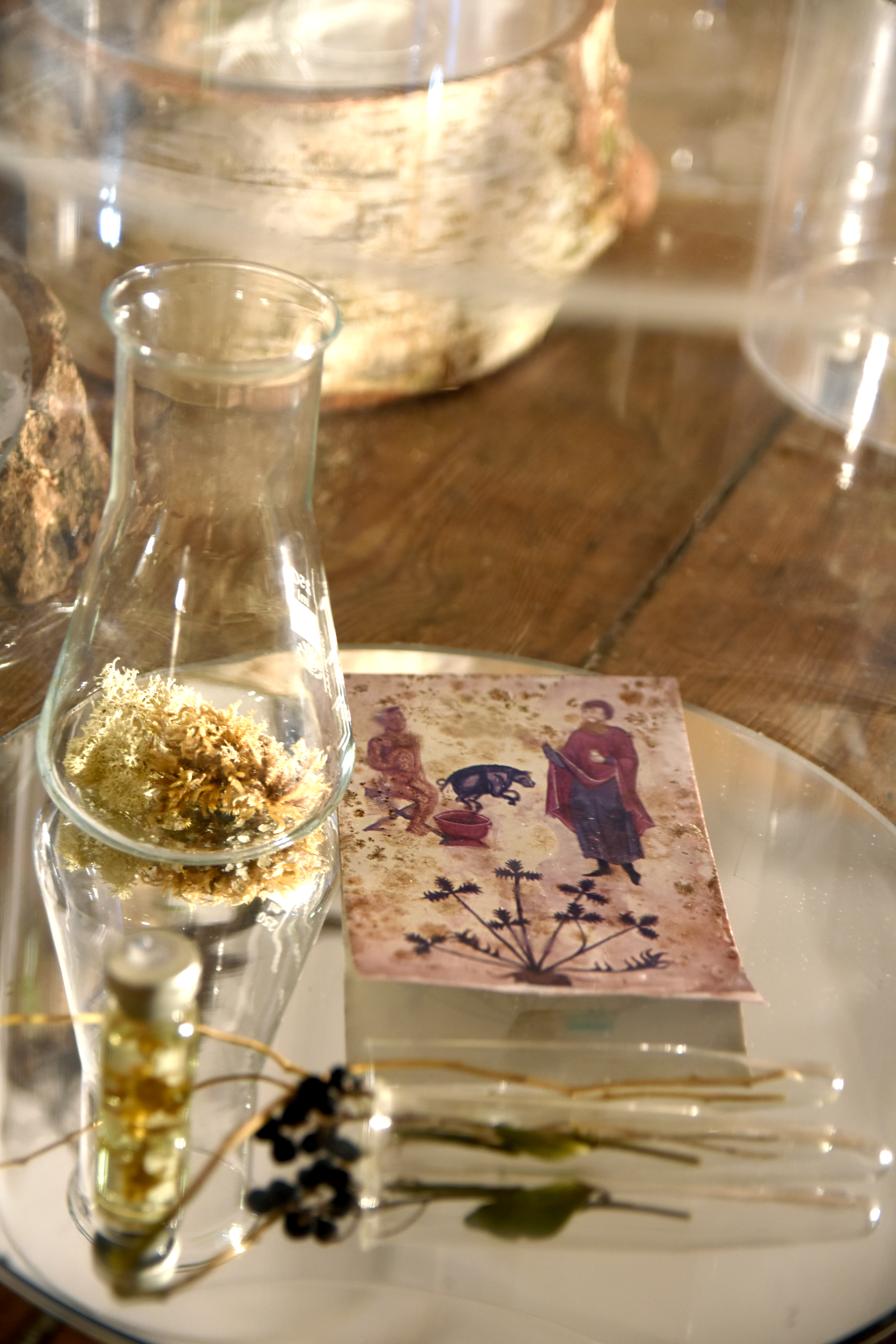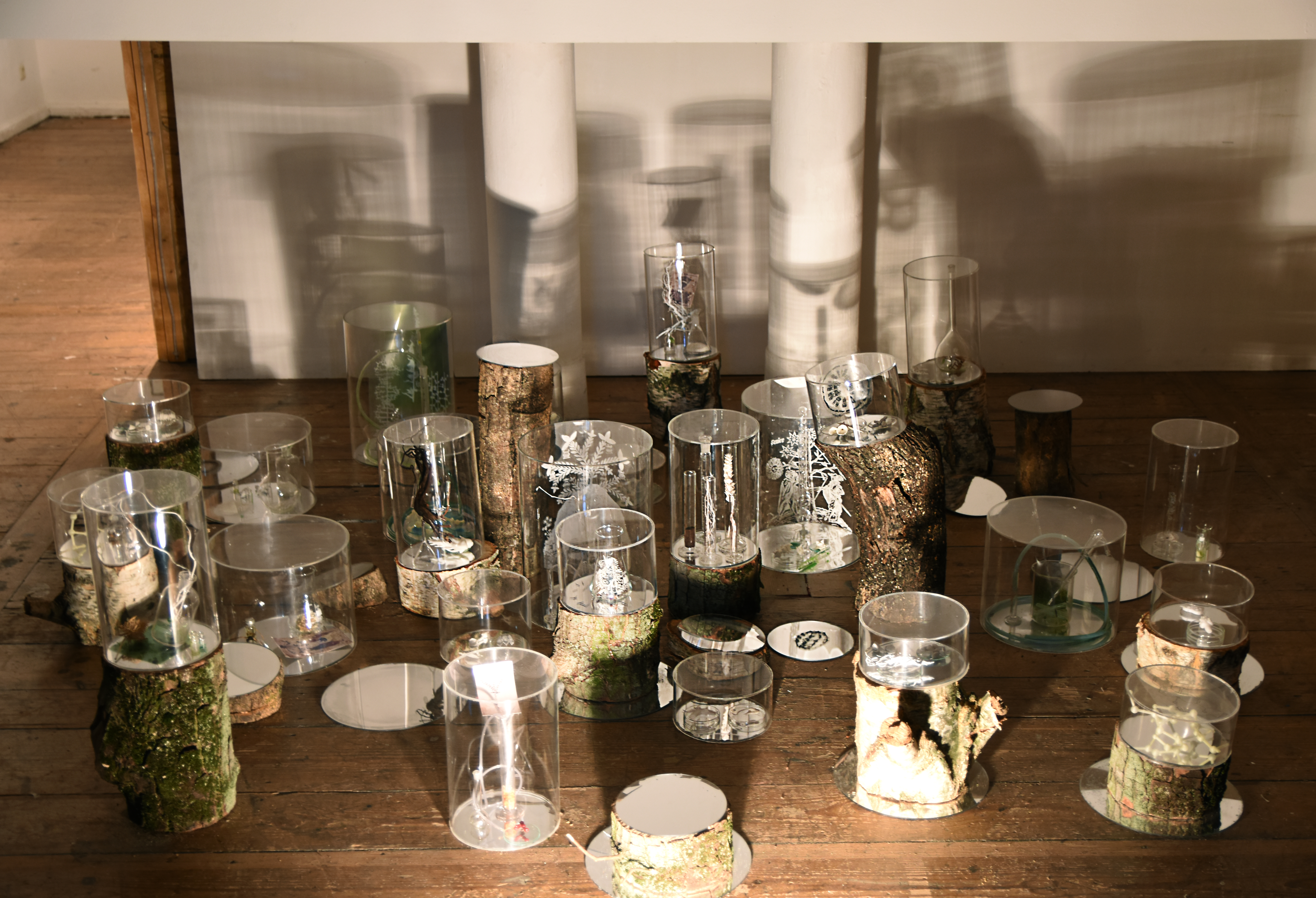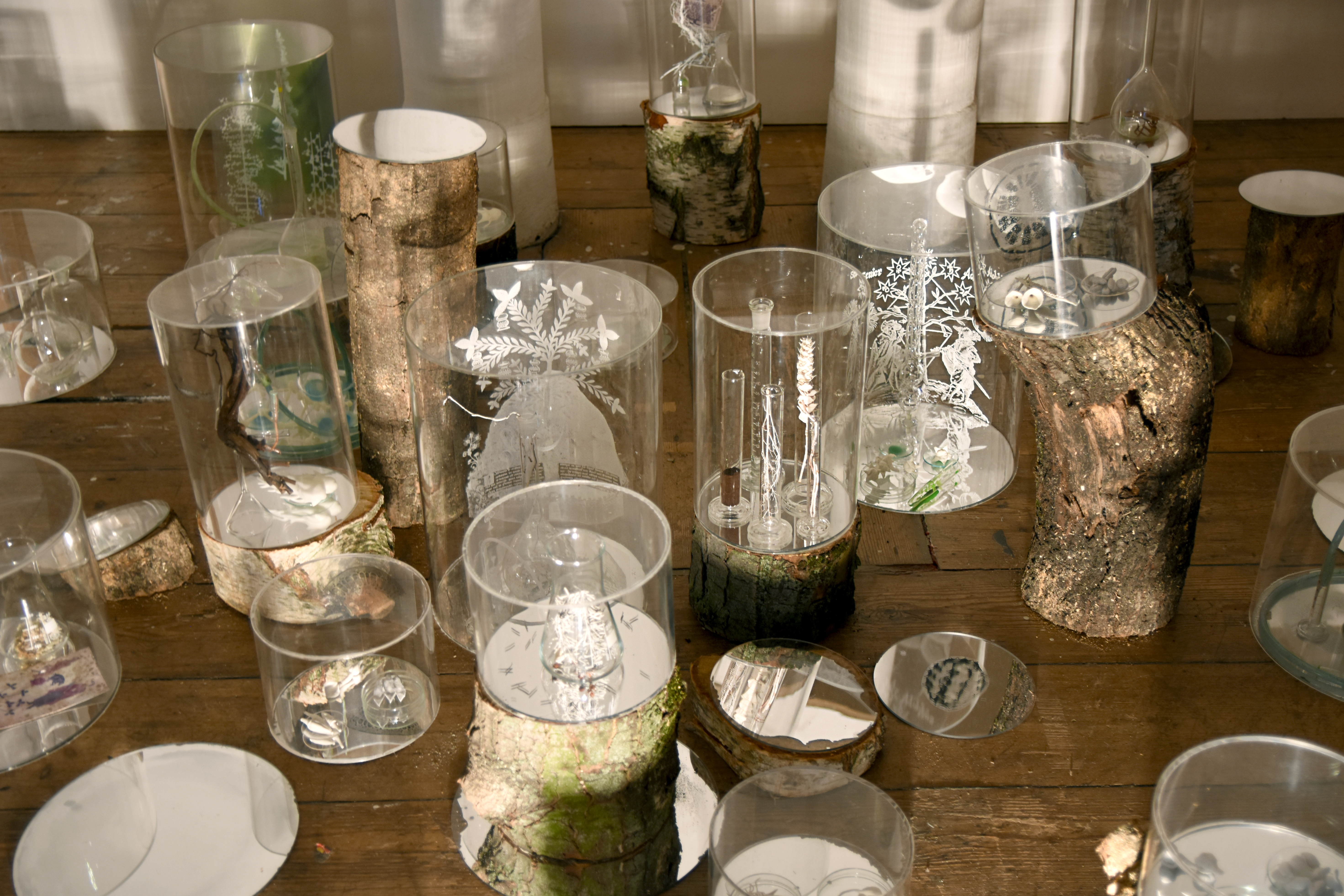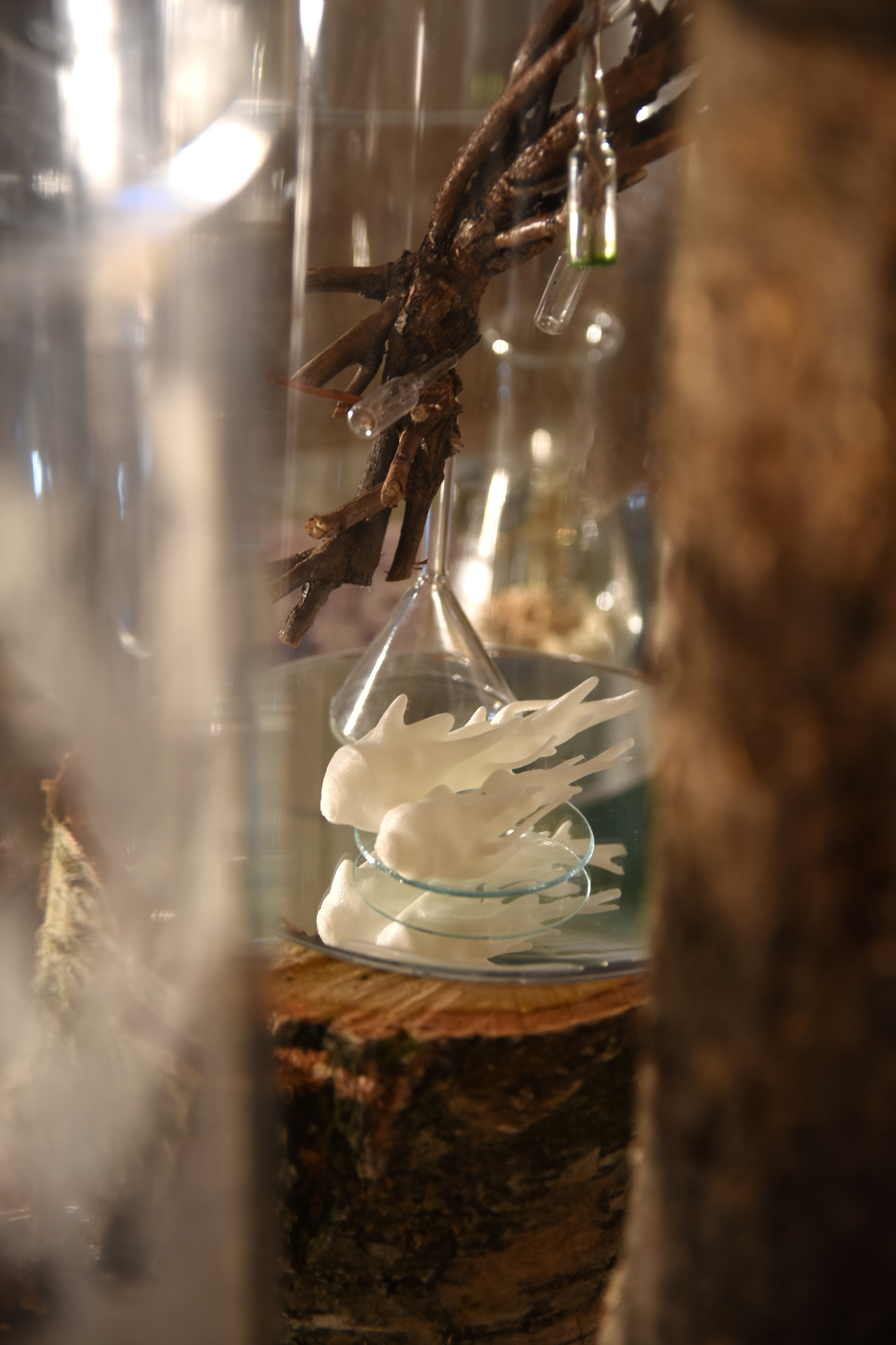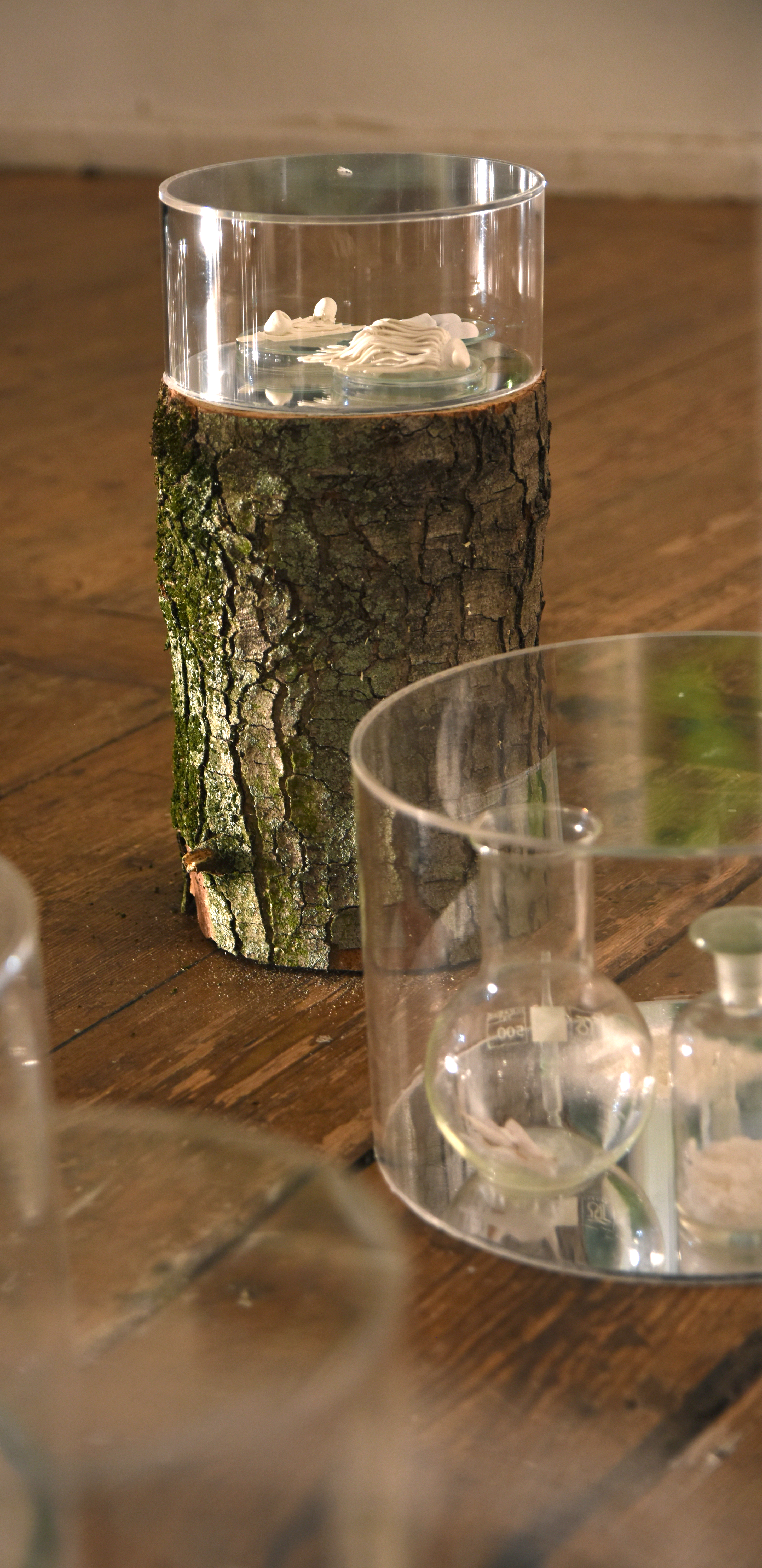 Transplant: a Forest for Chlorophyll Collapse revisits Janet Laurence’s Inside the Flower installation which she made for IGA Berlin 2017. The IGA work formed an experiential contemporary medicinal garden, immersing the viewer into our historical, spiritual and mythological relationship with psychotropic plants; an invitation to understand medicinal plants in a time of biochemical intelligence, when their roles in nature and history are being reconsidered. The Cellular Vitrines from Inside the Flower are here transplanted into a gallery context to bring renewed life to broken, fallen trees. Are they regeneration cells or medicines, analgesics for our wounded world? The world was once forest. The trees used in this installation are the remnants of the destruction waged this year by Berlin’s autumn storms, felling trees throughout the city. A medicinal garden sprouts out of the detritus of winds and floods symptomatic of global warming and endemic to the anthropocene, posing the the hopeful possibility of healing our planet.