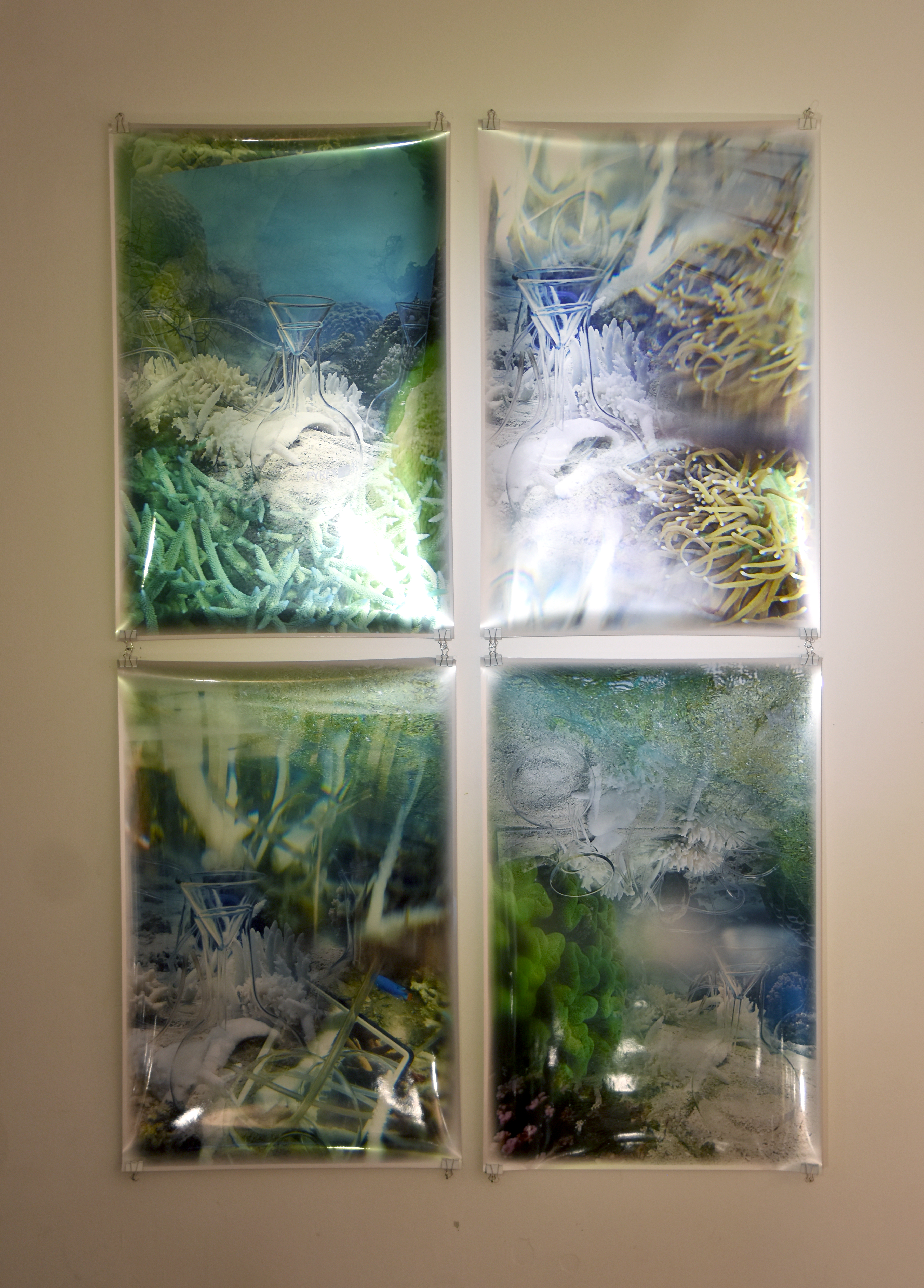 Janet Laurence’s video Deep Breathing – Resuscitation for the Reef (2015), and accompanying photo series Corral Collapse Homeopathy (2015) were created for the UN Climate Conference,COP21, in Paris. Shot in Australia’s Great Barrier Reef – a World Heritage site which is the planet’s largest living, and rapidly dying, structure – this series of works envisions a hospital for the Reef’s threatened corals and other marine species, making visible the otherwise invisible devastation beneath the surface of the sea, and offering hope for the healing of the marine world from the consequences of global warming and human impact. If we can care for marine life in the same way that we care for our own species, there is a chance of deflecting environmental catastrophe. Laurence’s work is an emergency response: a hospital for the Reef in this time of ecological crisis, intended to aid survival and effect transformation.