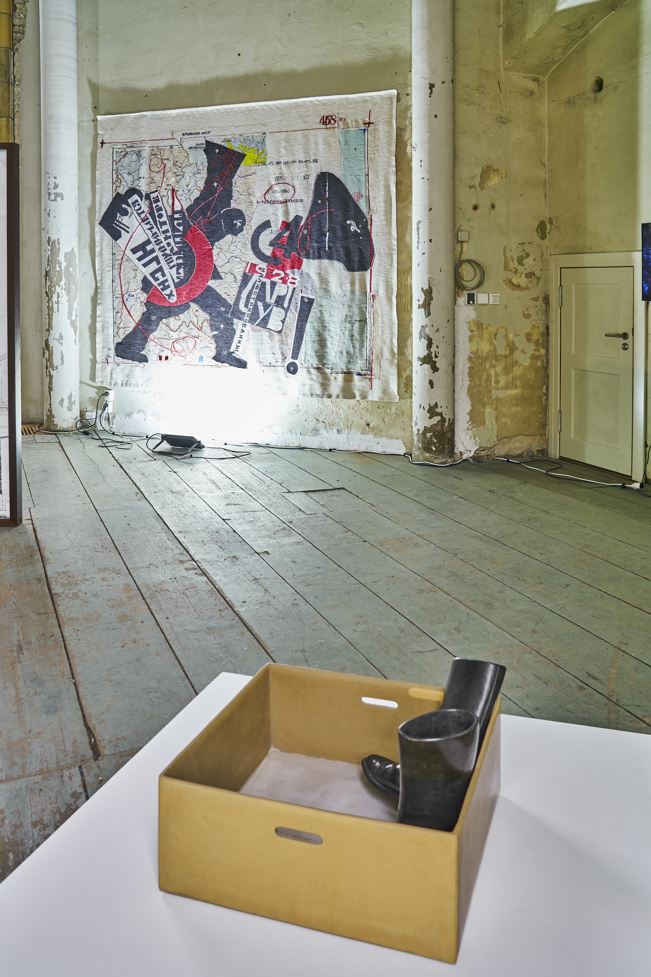 POINTS of RESISTANCE IV: Skills for Peace presents three of Andreas Blank’s iconic works – a businessman’s white shirt carefully folded atop his briefcase, and military boots standing upright in their box, ready to wear. The juxtaposition of these two works is sadly emblematic of our times. With the Russian invasion of Ukraine, war has tragically returned to Europe. In many Ukrainian cities, people are working from home or from bomb shelters, while offices are allocated to the streams of refugees fleeing from homes turned into battlegrounds. Those conscripted into the war on both sides, forced to fight for expansion or required to stay and defend their homeland, have replaced their business attire with combat boots, and their briefcases with guns. And with so many lost lives being mourned in Ukraine, Blank’s basalt shroud hanging on the wall is reminiscent of the mirrors draped over in black in the houses of the dead. “To a certain extent, the work has an archaeological character: the contemporary world, here: German history, becomes petrified, it acquires timelessness. In this case, a real pair of leather military boots, with which Andreas Blank’s grandfather returned from the war and from captivity, was the template – the boots were stored in a box under the roof for decades. The box was then set in stone to form the inverted base. The pedestal is also a time depot at the same time. It is a real anti-war piece.” – Stephan von Wiese