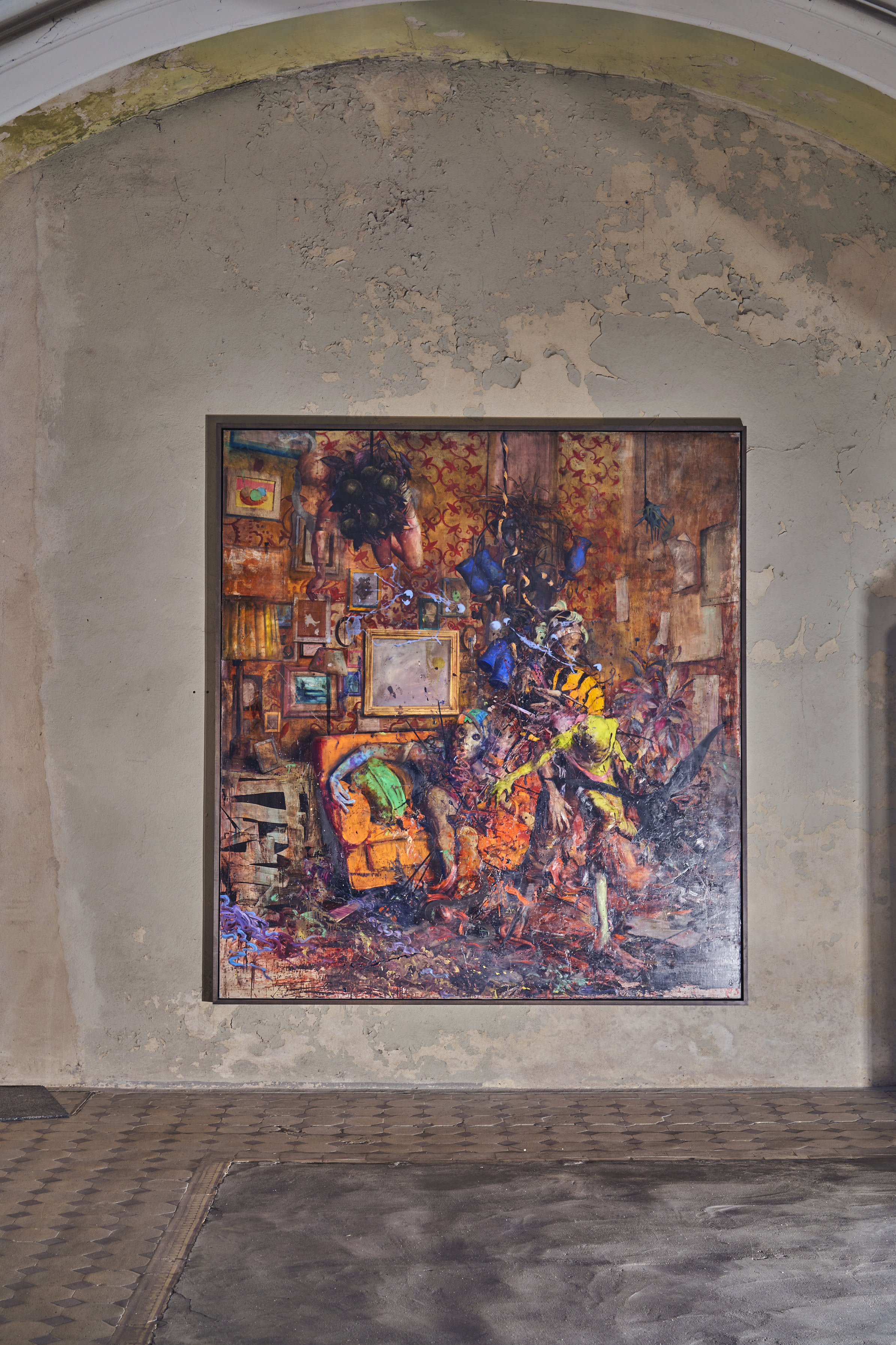 In the mystical, theatrical paintings of Jonas Burgert, the figures move in front of a membrane of cultural symbols and archaic patterns that seem to come down to us from another dimension. Jonas Burgert personifies human psychology through figurative painting bordering on the grotesque. Astutely observing the minutiae of daily life, he bears witness to the entire range of human emotion. Loneliness, hatred, revenge, vanity and excess – a parade of human expressions feeds his imagination – giving form to the characters within his tableaux. There is a timeless sense of other dimensions and emotional undercurrents reflected in the ruptured layers of Burgert’s environments. Often breached by characters and architectural features, these tears in the pictorial plane reveal various levels existing simultaneously. Burgert’s canvasses abound with rubble, detritus, remnants of history, cinders of the art of painting – the very cinders that serve to feed greed. However, they are of a fleeting nature. Their purpose is to devour the images and to unleash from the chaos the impulse and those emotions that linger in the memory.