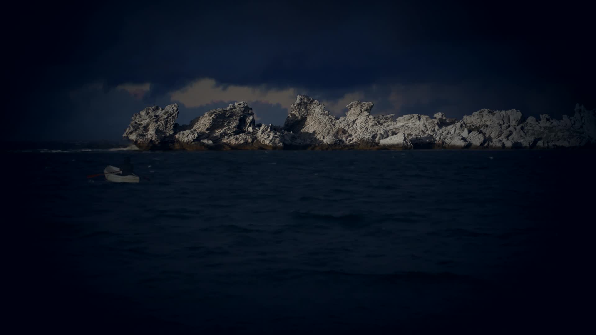 Paradise Falls II follows an Aboriginal man as he rows towards the craggy silhouette of Wadjemup/Rottnest Island. He too appears and disappears from sight, finally lost to the inky black of the ocean. The island was the site of an Aboriginal prison that is barely acknowledged in the historical record. The film portrays a man rowing back to his captors, highlighting that history can not always be forgotten. The spectral characters in Paradise Falls I & II are stand-ins for fractured and partial histories that disappear from focus, yet continue in our collective psyche as dark and haunting traumas.