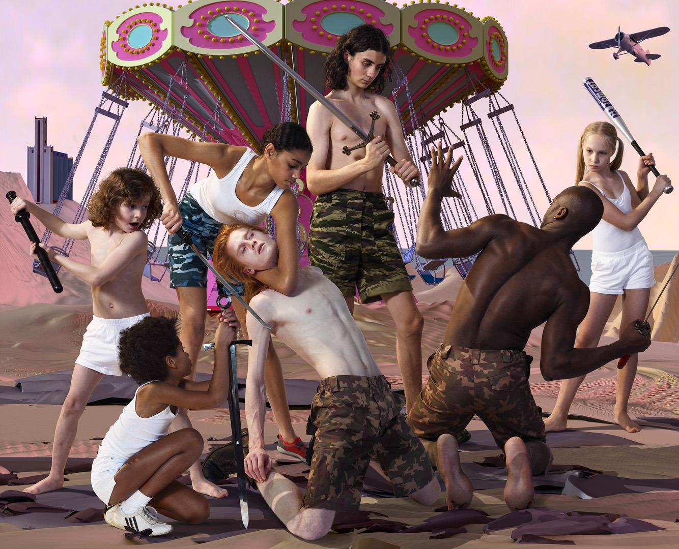 Last Riot is a reflection on the exponential growth of virtuality at the end of the twentieth and beginning of the twenty-first centuries, on the disassociation between real violence and its representation in media, and on humanity’s perpetual drive toward total destruction, always thwarted by its near-comical inability to achieve it. Last Riot depicts a world of endless strife and conflict, its young, androgynous inhabitants having shed their identities in a fight against both the self and the Other. As in a video game, the protagonists of Last Riot are unable to die while everything else is destroyed around them—there is no longer any history, ideology, or ethics, only the all-consuming Riot.