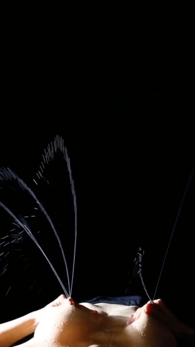 Choosing the compositional angle was paramount. Should the milk spray upward, downward, or straight ahead? When my supine body became both pool and altar, and the milk shot vertically into the sky, the tension of the body was perfectly captured—a breathing, aching monument of a fountain emerged. Under Caravaggio-esque chiaroscuro, the grainy details blurred, leaving the white milk starkly visible. The specifics of the two breasts faded away, replaced by a breathtaking landscape in the frame: two towering active volcanoes spewing milky-white lava.