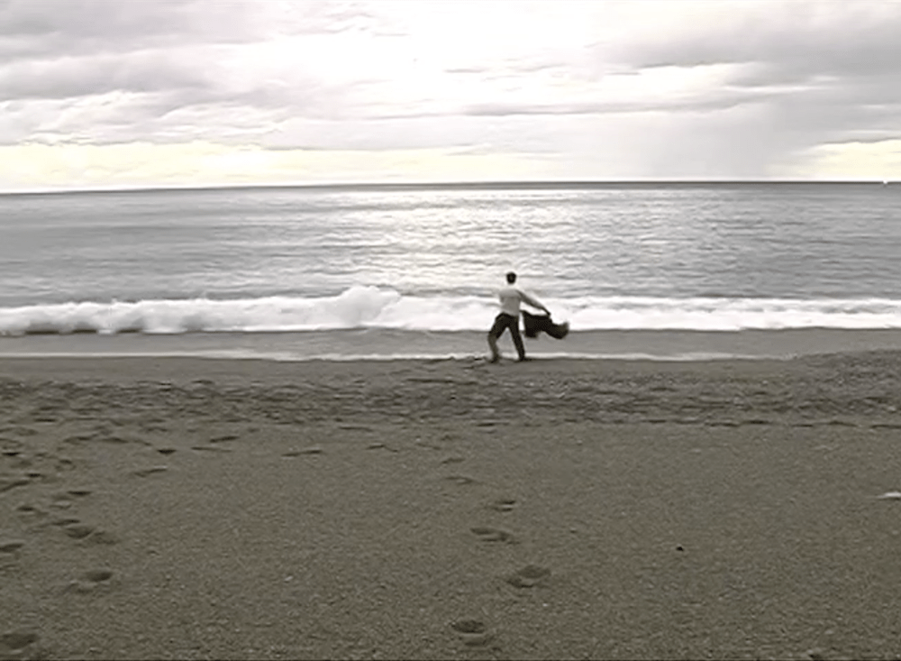 The video shows a man fighting against the waves of the sea – faced with the huge sky and the width of the sea, sometimes he abandons the fight, but then he comes back with new bravery: as a torero in the arena but also as Don Quixote against the windmills.