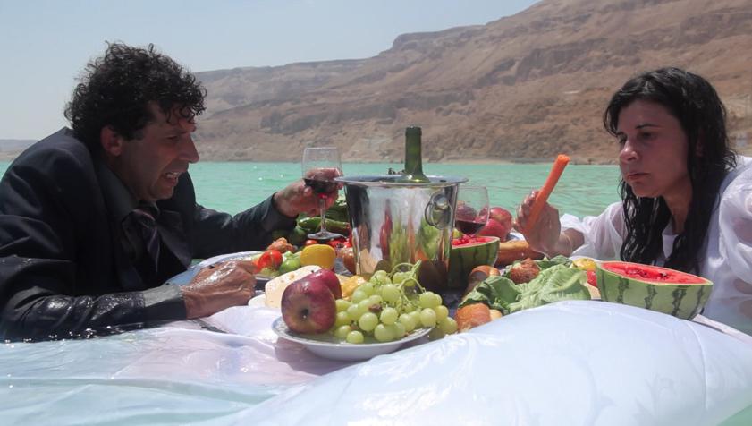 Turkish/German artist Nezaket Ekici and Israeli artist Shahar Marcus together address geopolitical and environmental forces through the medium of performance in their video Salt Dinner (2012). Shot in the scorching heat of Israel’s Dead Sea, their performance ironically confronts human endurance with the extremes of nature and culture. In this actual and political hotbed, Muslim and Jew share an opulent feast. Whether a wedding or a wake remains unclear, but what looks like an absurd aquatic picnic is in truth a brutal endurance test for both artists. The excess of salt they are consuming with the sea water is as lethally dehydrating as the midday sun. Shot in a rapidly shrinking ocean in a part of the world fought over for millennia, this international summit offers no solutions for political and environmental stability.