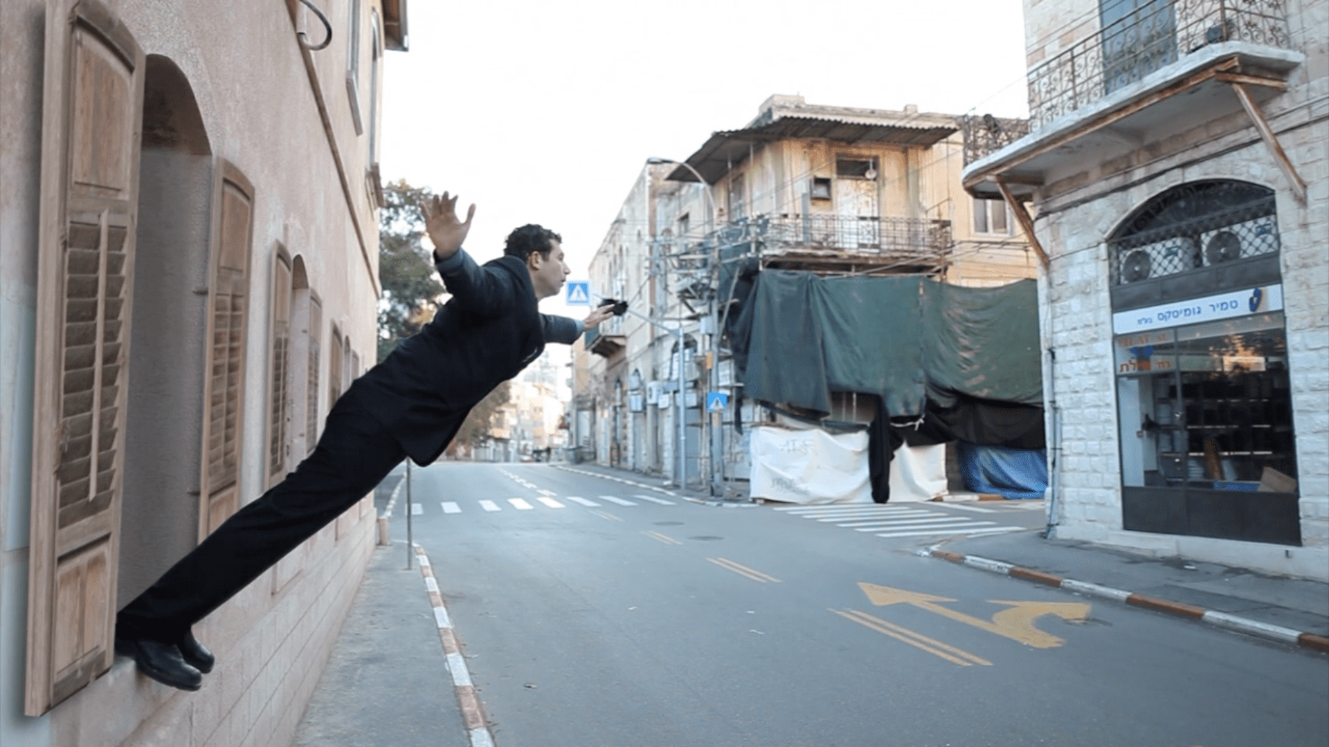 The video leap of faith starts with a shot of the artist wearing a suit, standing on the window’s edge, getting ready to make the leap of his life to the wide open space. The artist is hesitating, having difficulties in creating a momentum to jump, but eventually jumps. Surprisingly he freezes horizontally, while his feet touch the window’s edge – homage to the known work of Yves Klein “Artist jumps into the void (1959). When the shot opens up it appears that the window from which the artist was afraid to jump is just a few feet above ground. The camera stands still presenting a grotesque and surreal image of the artist hanging between heaven and earth.