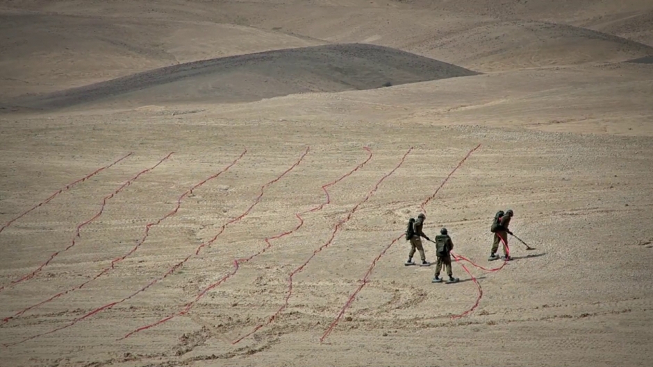 The visually stunning work Seeds (2012) follows a mine clearance team through the desert as they locate and remove land mines. The violence implicit in this action – both the danger of detonation, and the allusion to the conflict which laid these weapons there in the first place – is offset in sharp contrast with the beauty of the natural landscape and the slow meditative actions of the mine disposal crew. As they move over the arid rocky soil, they leave behind themselves trails of red tape, demarcating the landscape into clear rows. A solitary figure enters the frame, following behind the soldiers. In a reference to Millet’s famous painting, The Sower, Shahar Marcus, dressed as a pioneer, walks along the rows of earth, sowing seeds in the newly cleared soil. This act of sowing becomes a healing gesture, planting new life and hope in the scarred earth. Seeds is a poetic work about war and the hope for peace, and about the need to heal the wounds left upon our planet by mankind’s devastating impacts upon nature.