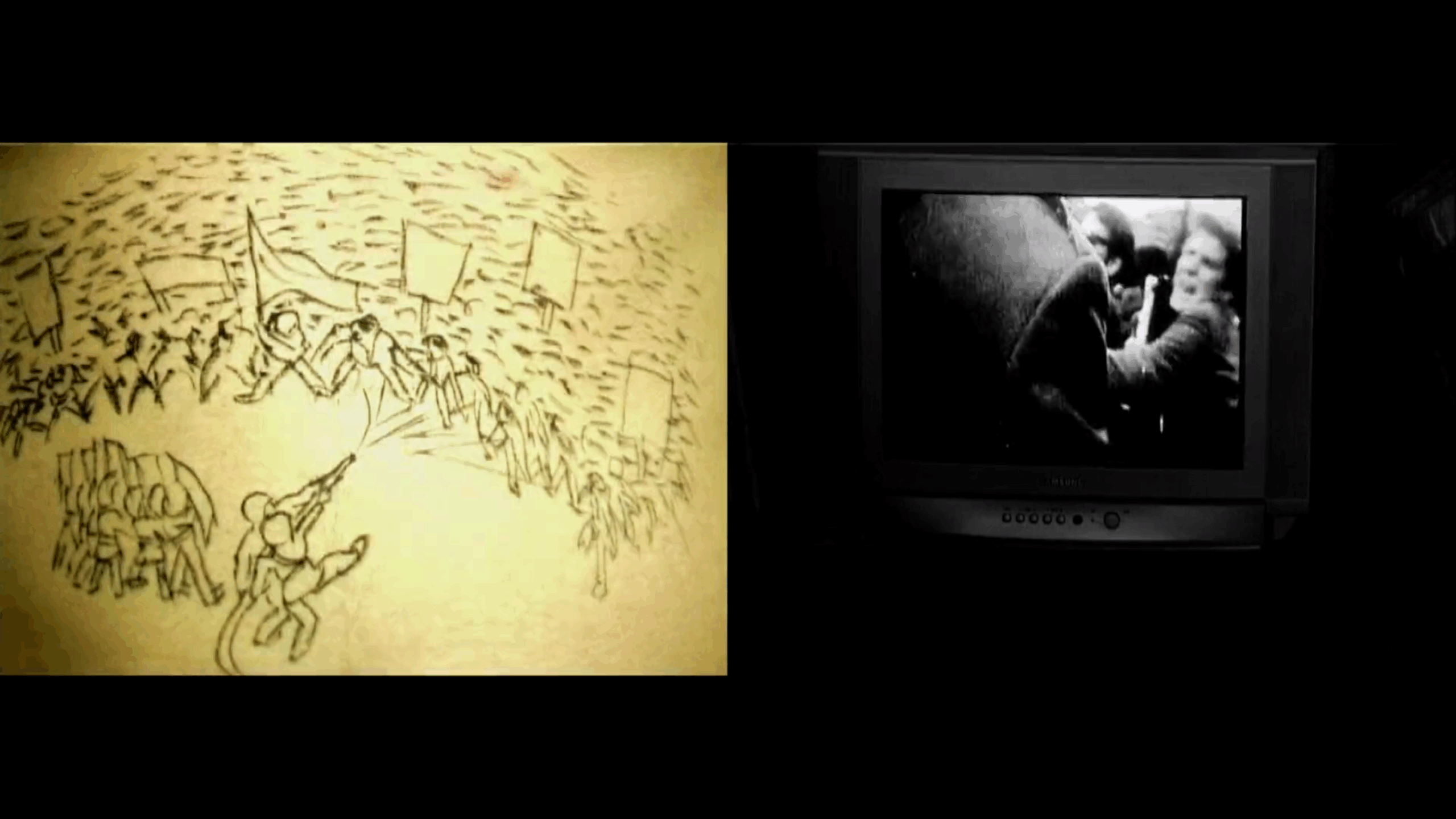 The video uses the interaction of two screens, and is made up of materials including body animation,multimedia images and performances. The visual and temporal disparity produced by the position,dislocation and juxtaposition of the two screens create a kind of interesting phenomenon:one that might perhaps cause people to investigate the source of representation of certain events.This is also a discussion concerning the cause and effect, control, mutual destruction and regeneration of the multiple relationships between everyday lives, texts,media and events. Additionally, the expression of the body language is not only a reflection of the ground’s stimulation to the outside: the body itself is a source of imagination and energy, and an unrestrained vehicle. If consumerism and entertainment have disintegrated the political nature of the body, then I attempt in this video, by adopting the habitual means of entertainment and hedonism, to transform the basic attributes of body politics.